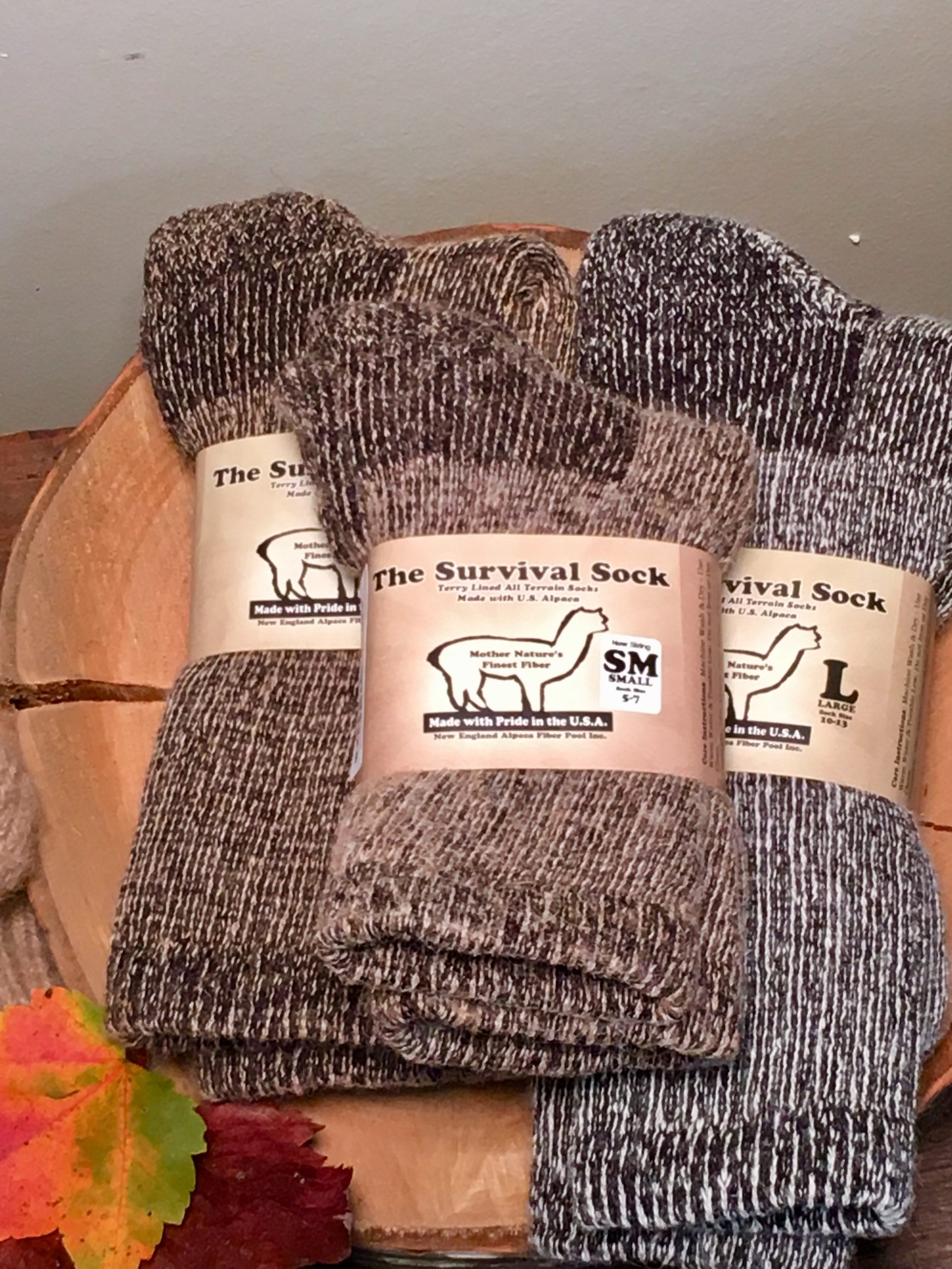 In a word: ultra-comfortable. Mid-weight alpaca lined knit sock designed for all-weather outdoor activities. Un-dyed New England alpaca fiber knit terry loop style with durable nylon outer shell. Reinforced arch for a cushioned fit with comfortable ribbed knit cuff. Made in the USA.